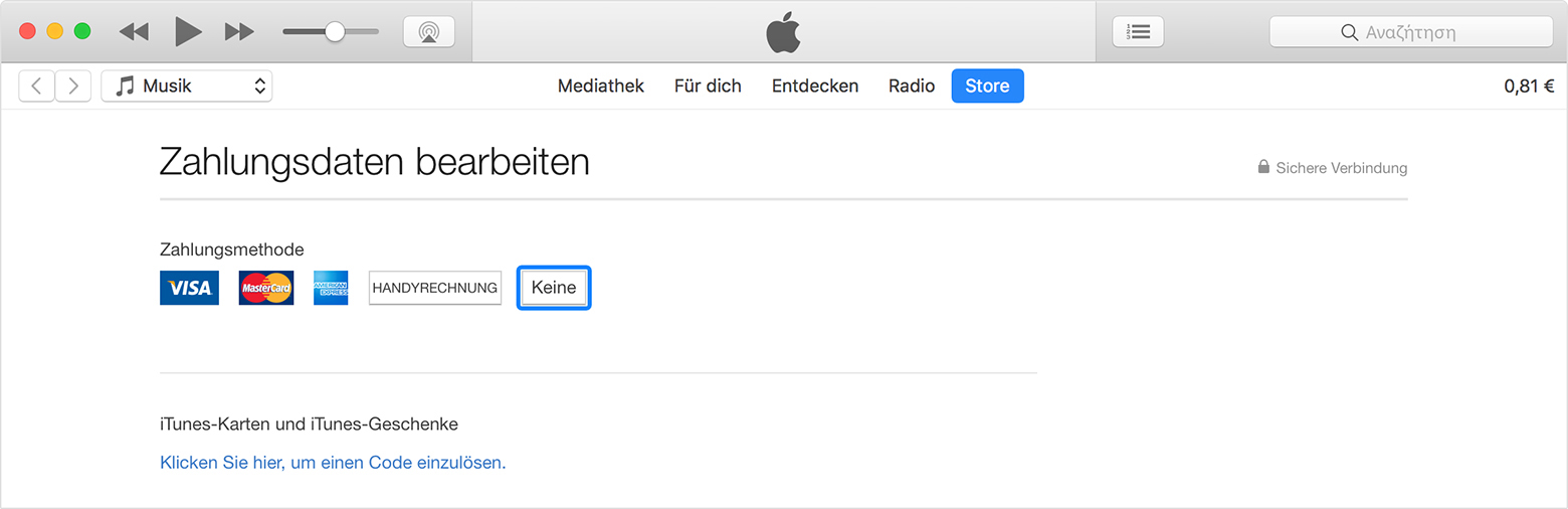 Andernfalls können Sie auch den Punkt Keine Zahlungsmethode. Mit dem Mac oder dem PC die Zahlungsdaten imStore ändern. Gehen Sie dort zuApp Store.